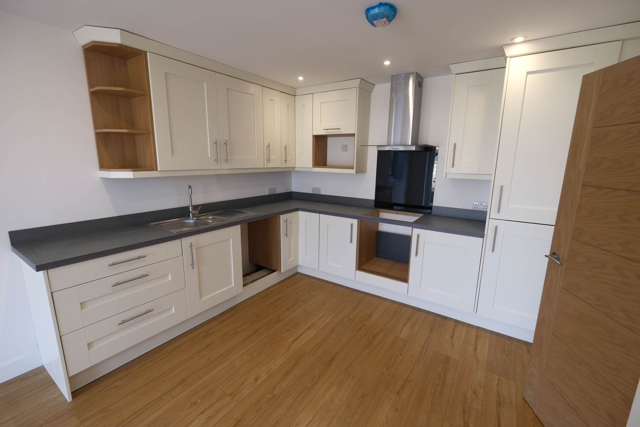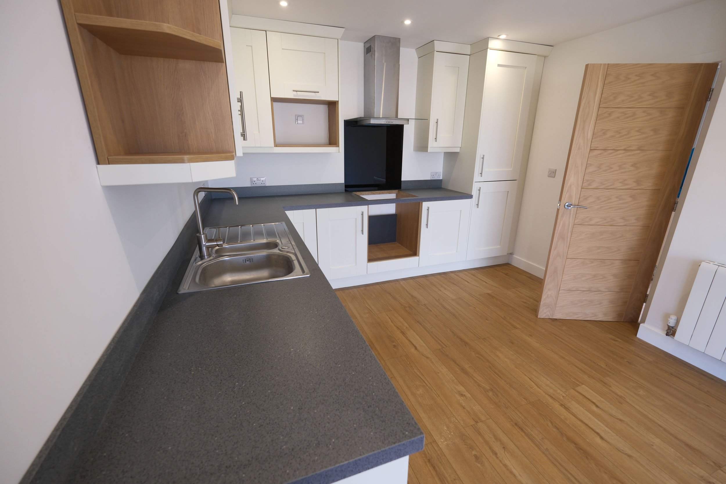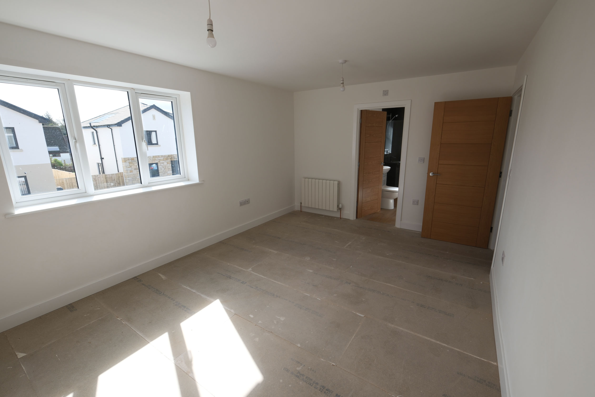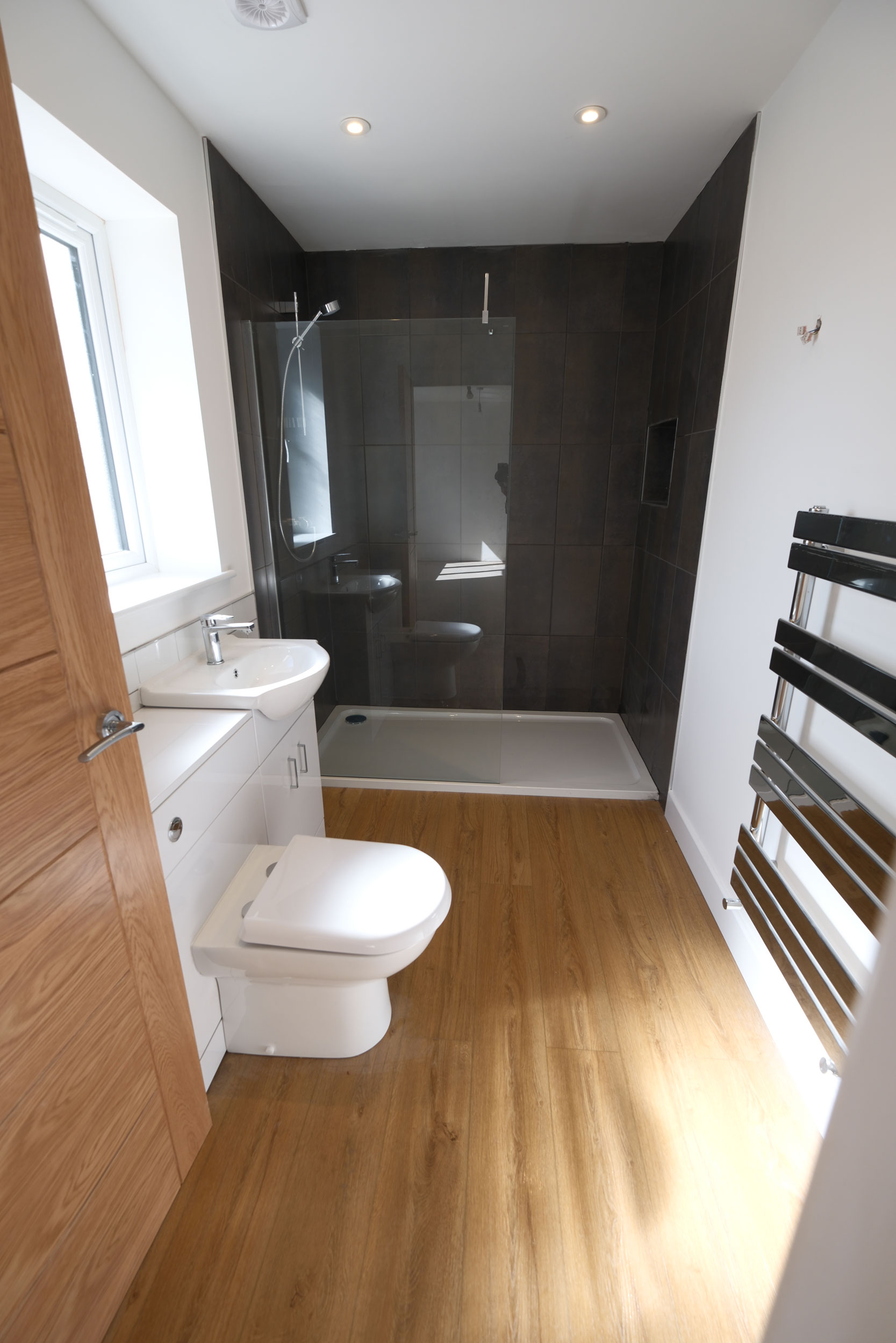 There are 3 bedrooms upstairs, all king/double and with generous in-built storage for clothes. There is an additional single bedroom downstairs (or alternatively a home office). The master bedroom has a large en-suite with walk-in shower. Tiled as standard with mirror and shaver socket.