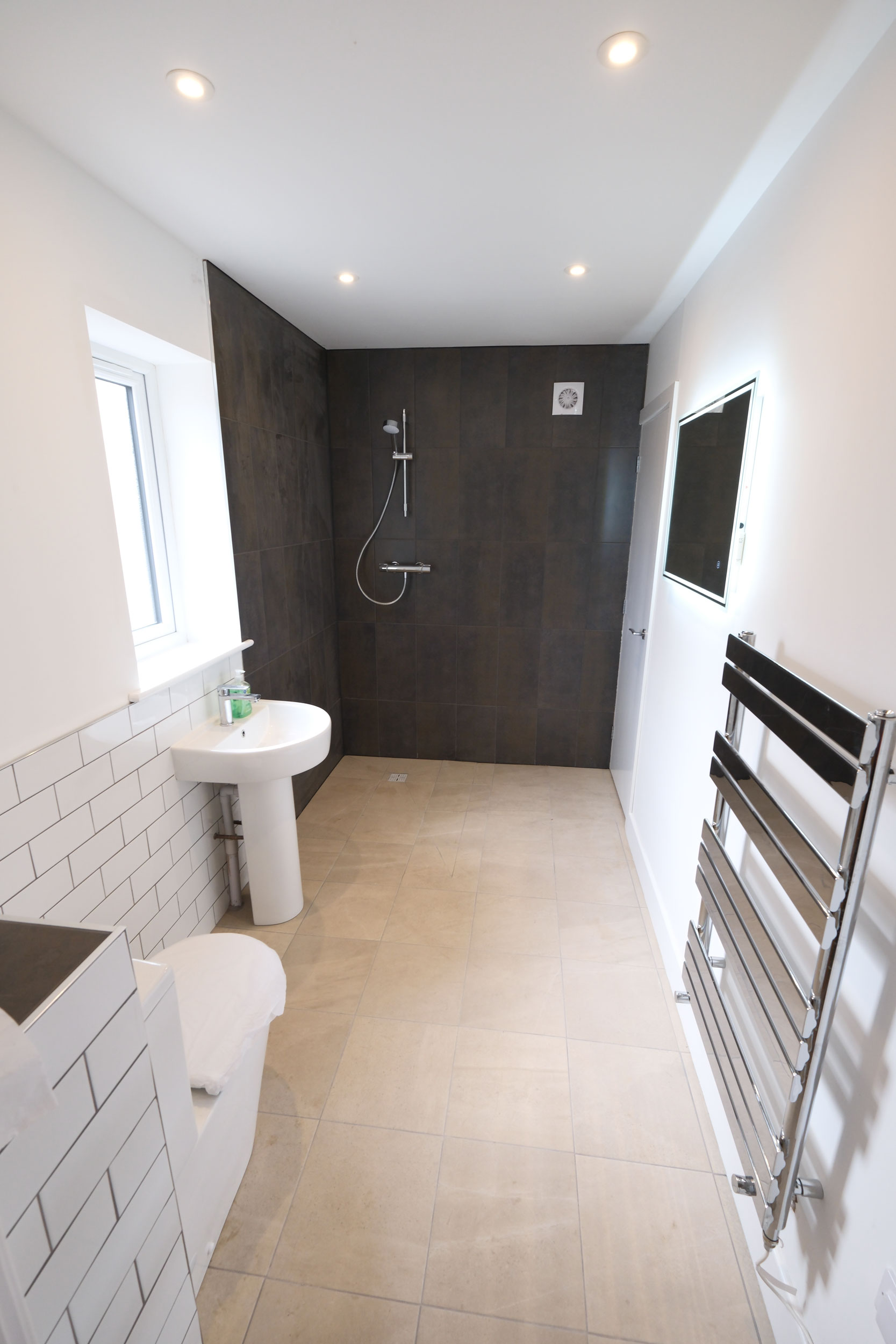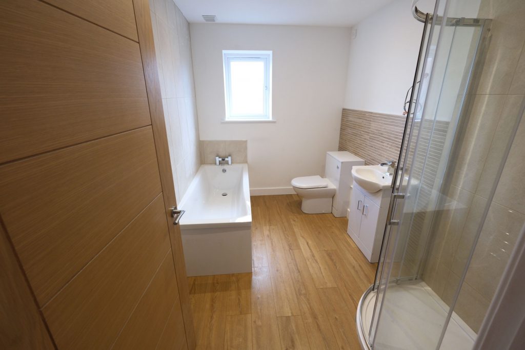 The family bathroom has a bath and separate shower (with rain head) as is tiled. LED mirror with shaver socket as standard.