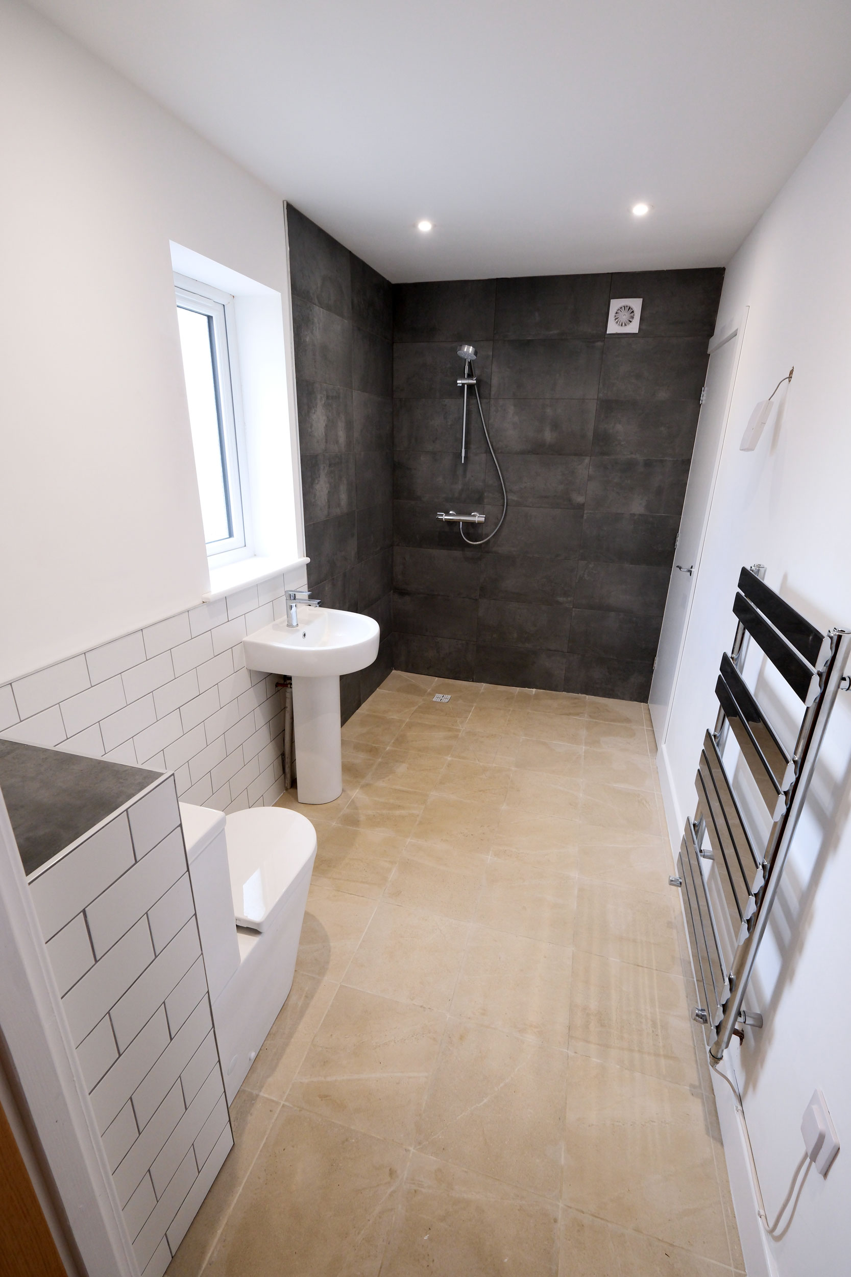 A tiled wet-room completes the downstairs with an off-set area for a washing machine, keeping laundry out of the kitchen.