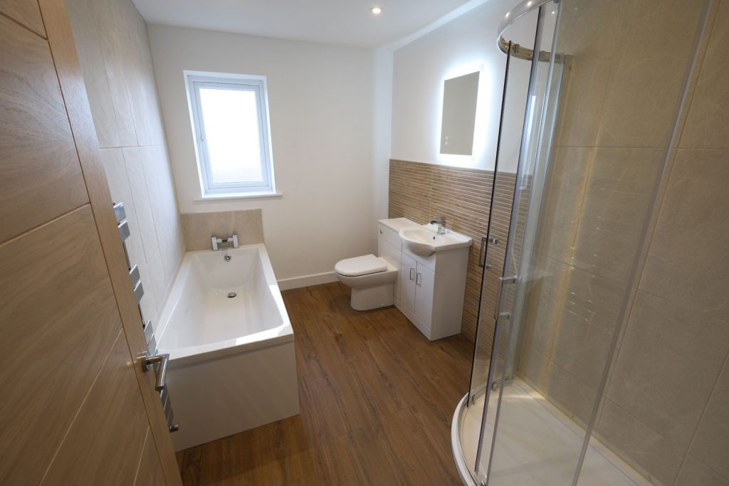 The family bathroom has a bath and separate shower (with rain head) as is tiled. LED mirror with shaver socket as standard.