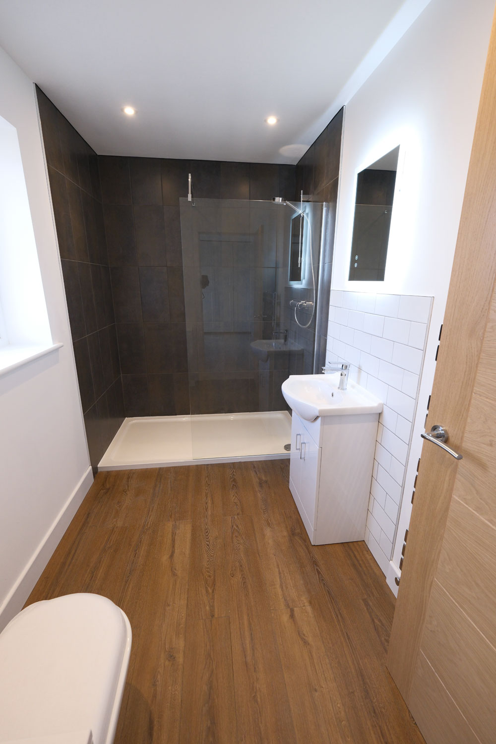 There are 3 bedrooms upstairs, all king/double and with generous in-built storage for clothes. There is an additional single bedroom downstairs (or alternatively a home office). The master bedroom has a large en-suite with walk-in shower. Tiled as standard with mirror and shaver socket.